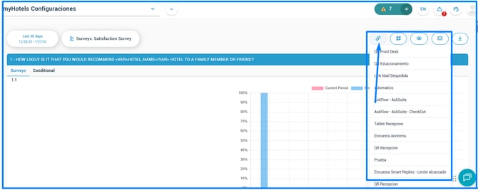 From here, you just need to click on the QR icon that you will find in the top right corner of the screen. If you have more than one survey, you must first choose the survey and then download the QR or link from the icon.