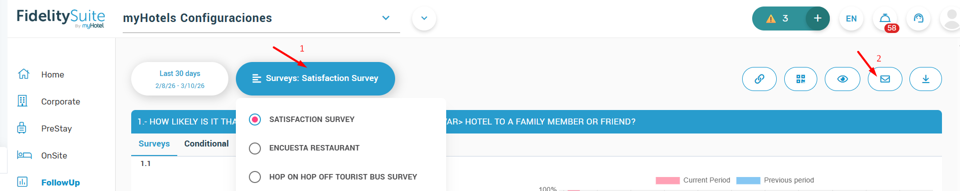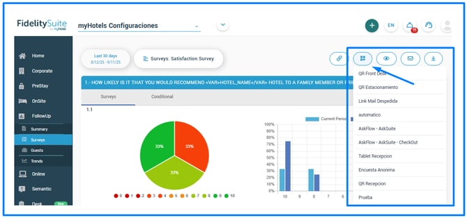 If you need to get the QR code or link to share your Onsite and/or FollowUp surveys with your guests, you must go to the Onsite or FollowUp Surveys section.
