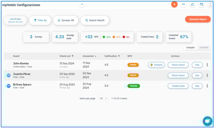 1.- From Onsite or FollowUp, go to the Guests section, where you can view all the surveys completed during the period: