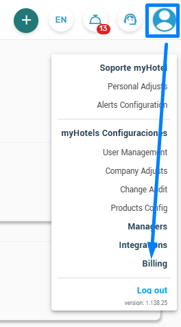 Once logged in, go to your user menu on the top right and click on the Billing option or enter from this link https://fidelity.myhotel.cl/invoice