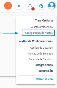 1. En la pestaña Alertas podrás configurar las alertas que recibes por correo electrónico y las alertas que puedes recibir en la web (ícono de campana) o en la App de myHotel.