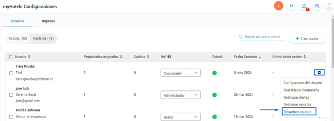 Para desactivar un usuario, debes hacer clic en el ícono de tuerca y escoger la opción Desactivar usuario: