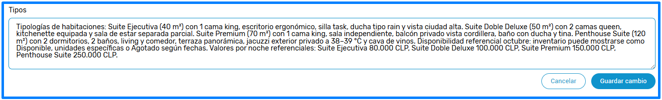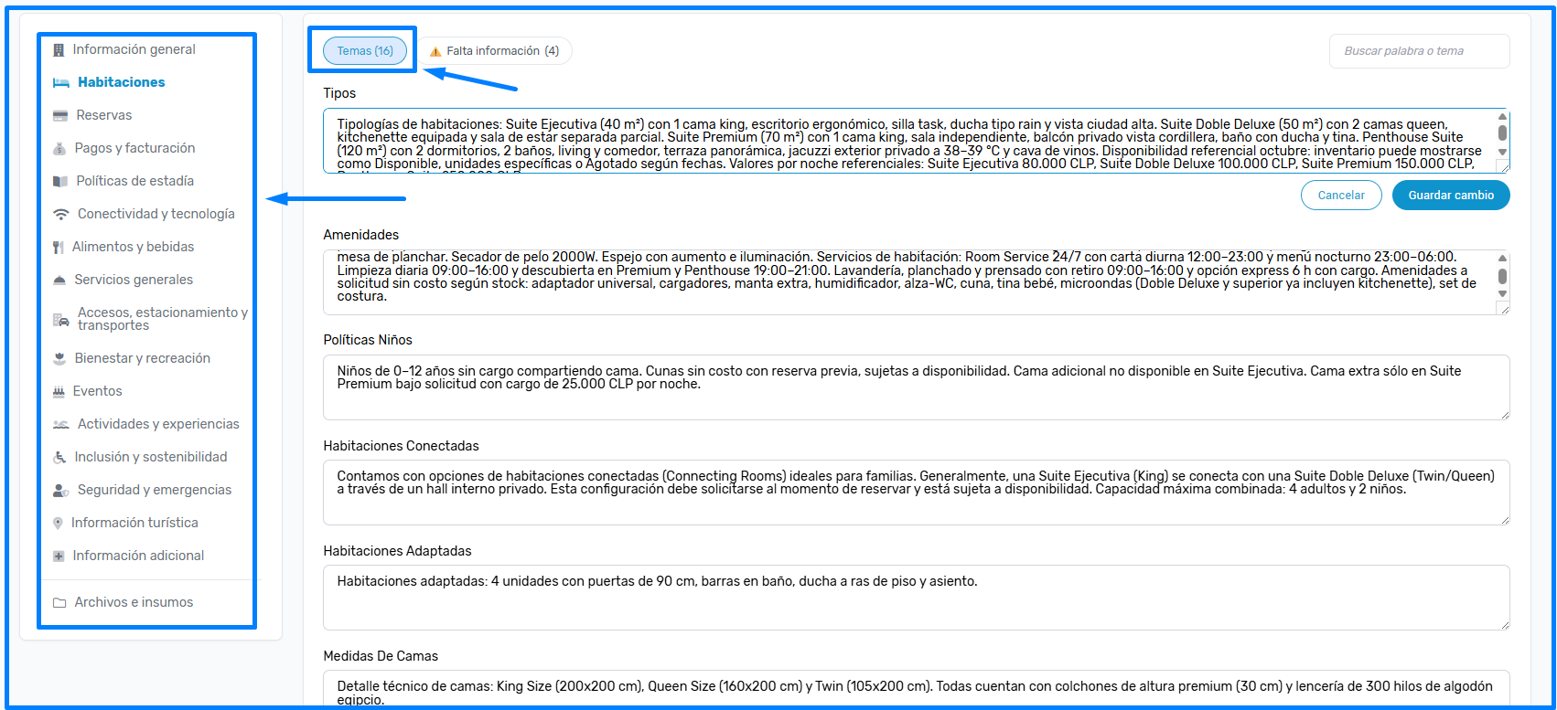 2. El enlace te llevará a la configuración de la Base de Conocimiento de Concierge, es acá donde se ingresa y organiza toda la información de tu hotel. En la parte superior, verás un botón indicando que hay información faltante.