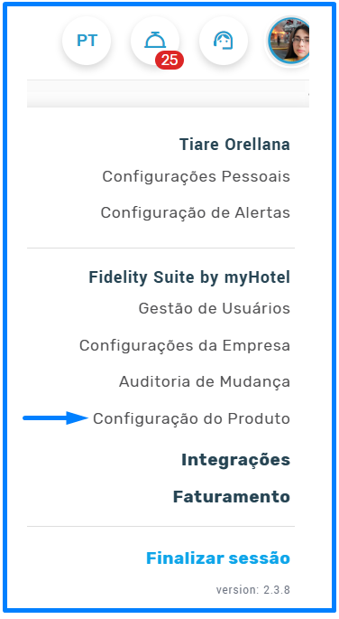 Se o seu Hotel já conta com o Concierge e você precisa realizar alguns ajustes, deve acessar o seu menu de usuário e escolher a opção "Configuração do Produto":