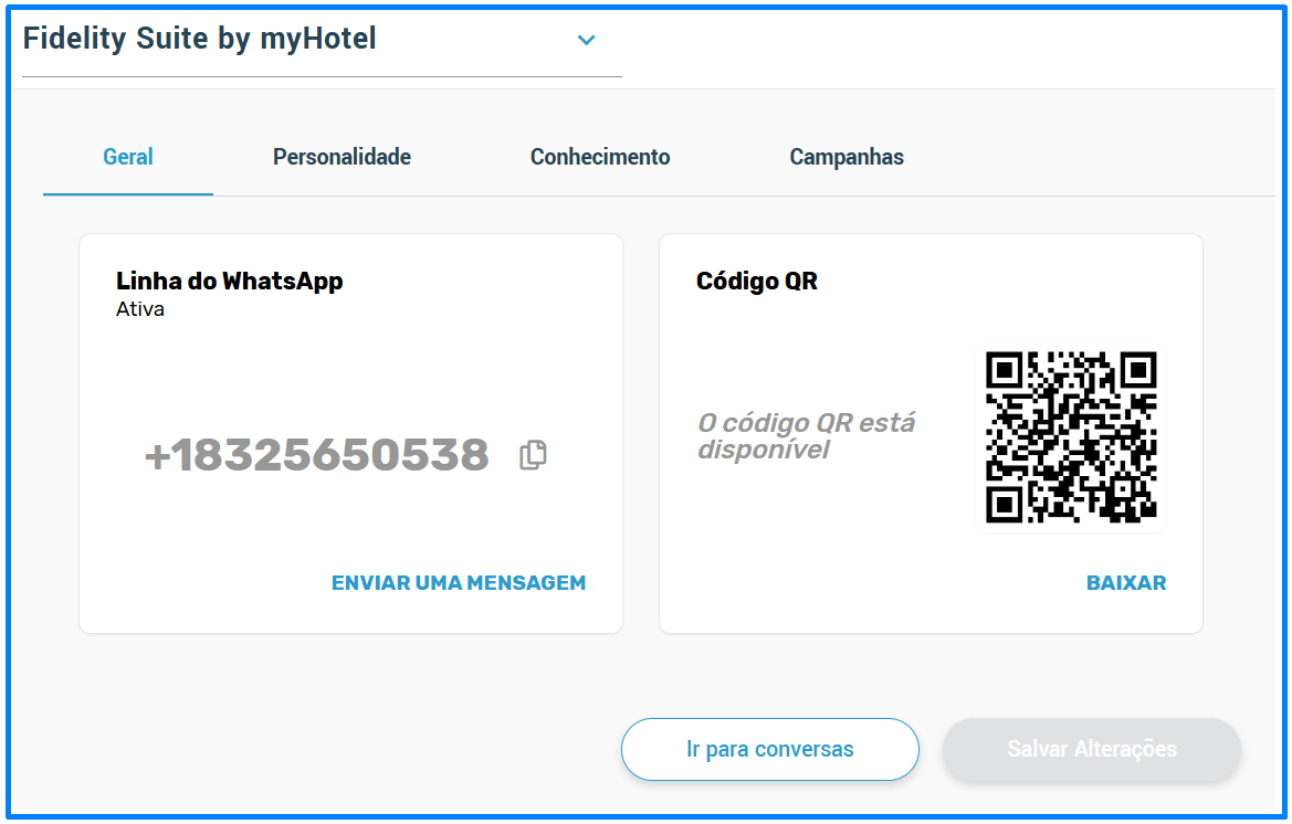 Nesta aba você terá acesso à linha ativa de Whatsapp do Concierge do seu hotel, pode copiar o número e enviar uma mensagem do Concierge para algum número de telefone. Também estará disponível o QR para download.