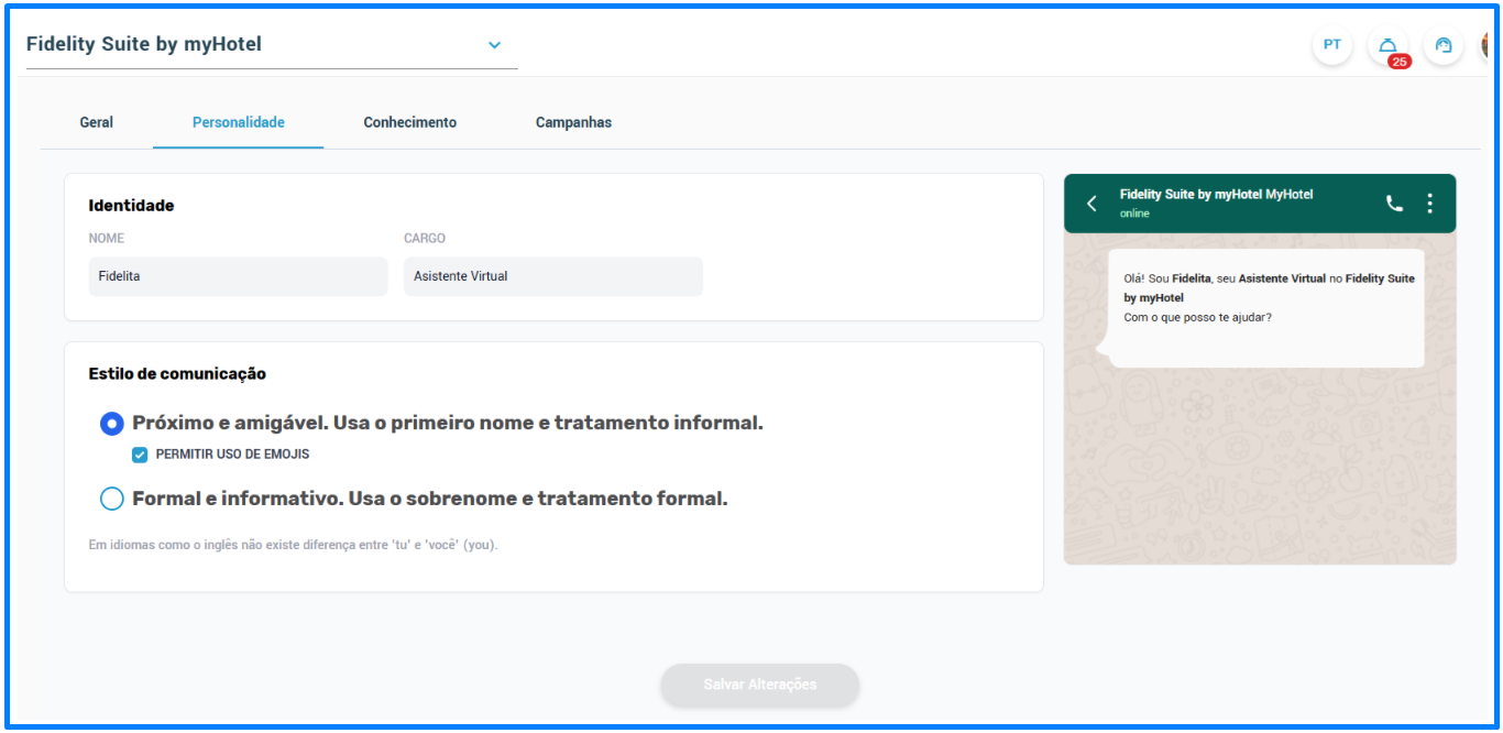 Nesta seção você poderá editar a Identidade do Concierge em seu Hotel, atribuindo um Nome e Cargo.